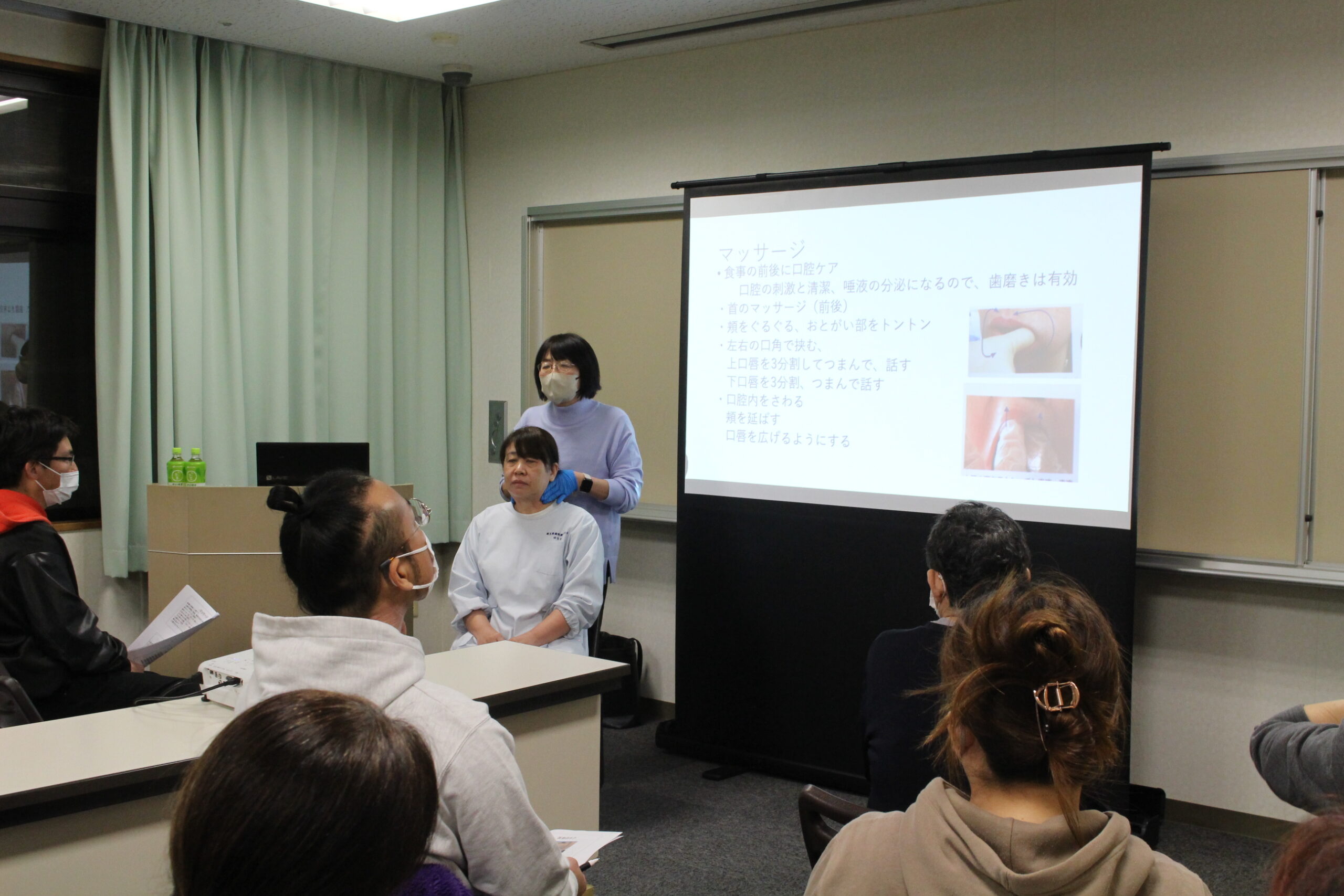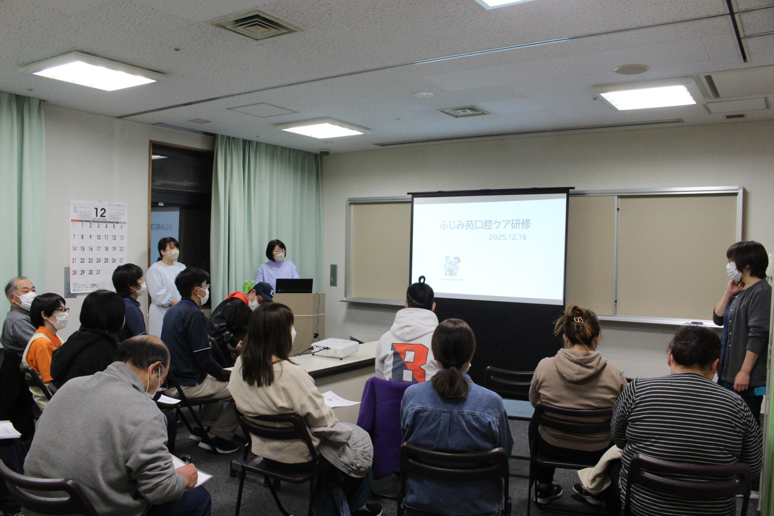 12月18日にふじみ苑の歯科衛生士である恩田様、塙様を講師にお招きして、口腔ケア研修会を開催しました。 日頃の入居者の口腔ケアについて大変勉強になりました。 早速、すぐに取り入れることが出来る内容もあり、大変貴重で有意義な時間となりました。
